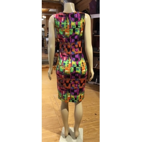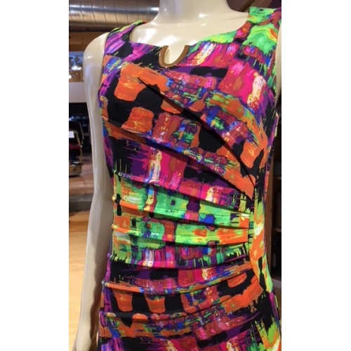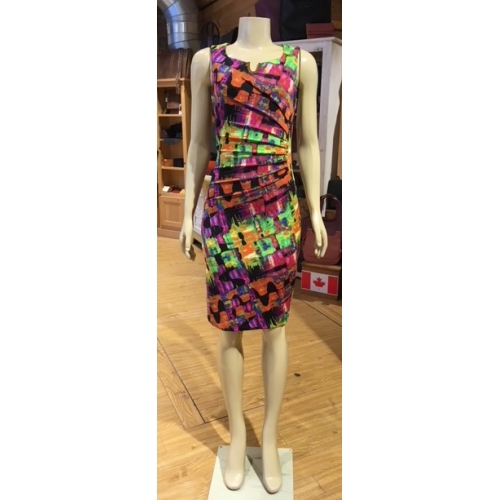 Joseph Ribkoff's fun and festive multicoloured pattern ruched sheath dress has gathers and rouching to the one hip. Zipper back, split rounded neckline, highly contoured and tailored waist with knee length hem.